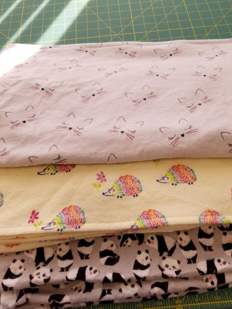 Most of the children we are making the bags for, are pretty young, including several who are under the age of two, so I thought flannel blankets would be pretty useful for that group. Here are the ones I finished hemming yesterday...